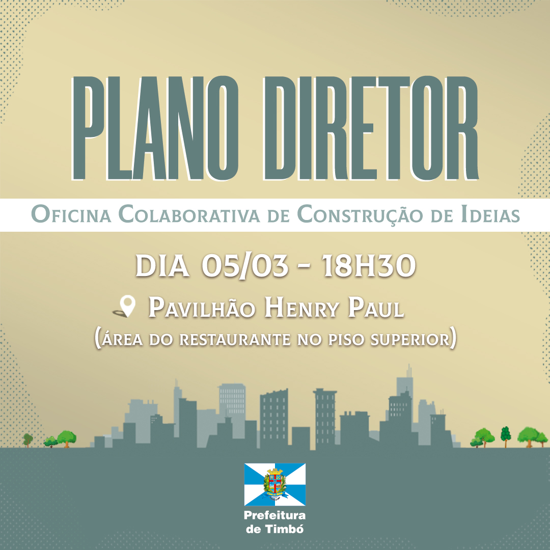 A revisão do Plano Diretor Municipal de Timbó entra em sua segunda etapa e para isso será realizada uma audiência pública em formato de Oficina Colaborativa de Construção de Ideias. O evento será no dia 05 de março, às 18h30min no Pavilhão de eventos Henry Paul (área do restaurante no piso superior). O evento é aberto e a participação da comunidade é fundamental para ajudar a construir os caminhos para o futuro de nossa cidade. Participar das audiências públicas é um ato de cidadania e dever social.