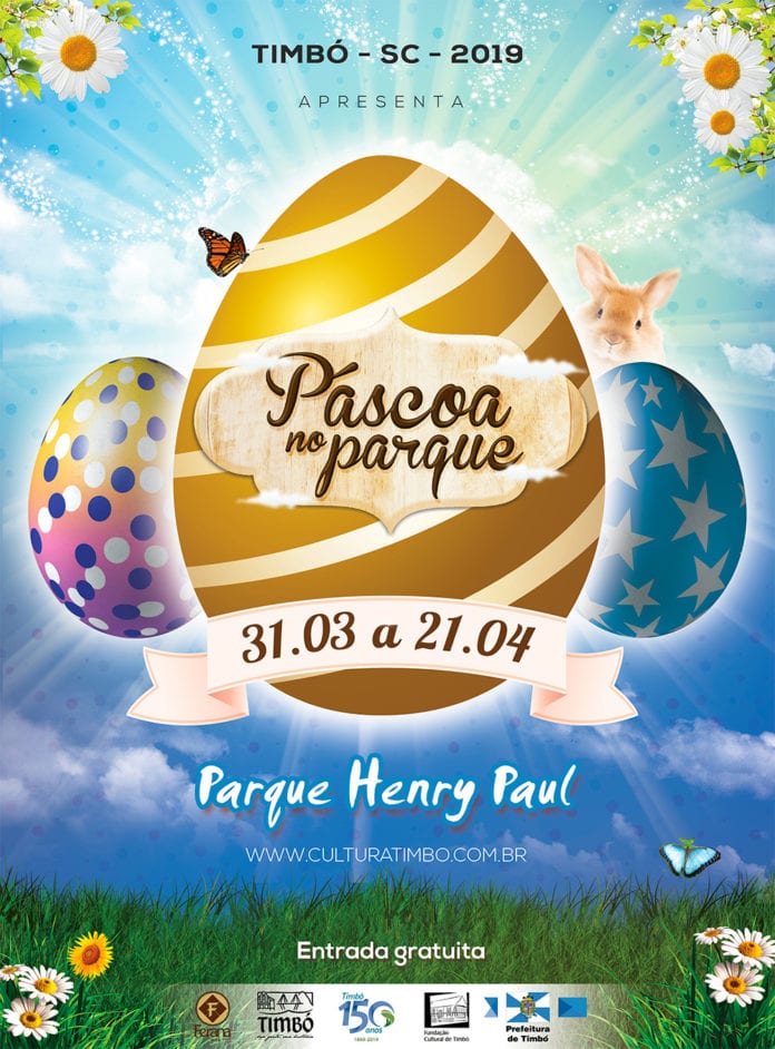 Os preparativos para a Páscoa no Parque continuam em ritmo acelerado no Parque Henry Paul, em Timbó! A programação de páscoa inicia neste domingo, 31 de março, com apresentação do Grupo Vaqueiros do Vale e Grupo Acendei, a partir das 18h. Durante todo o dia as atrações continuam com a presença da coelha, passeios de trem, oficina de pintura de casquinhas, pintura facial e brincadeiras para as crianças, além de venda de artesanato.