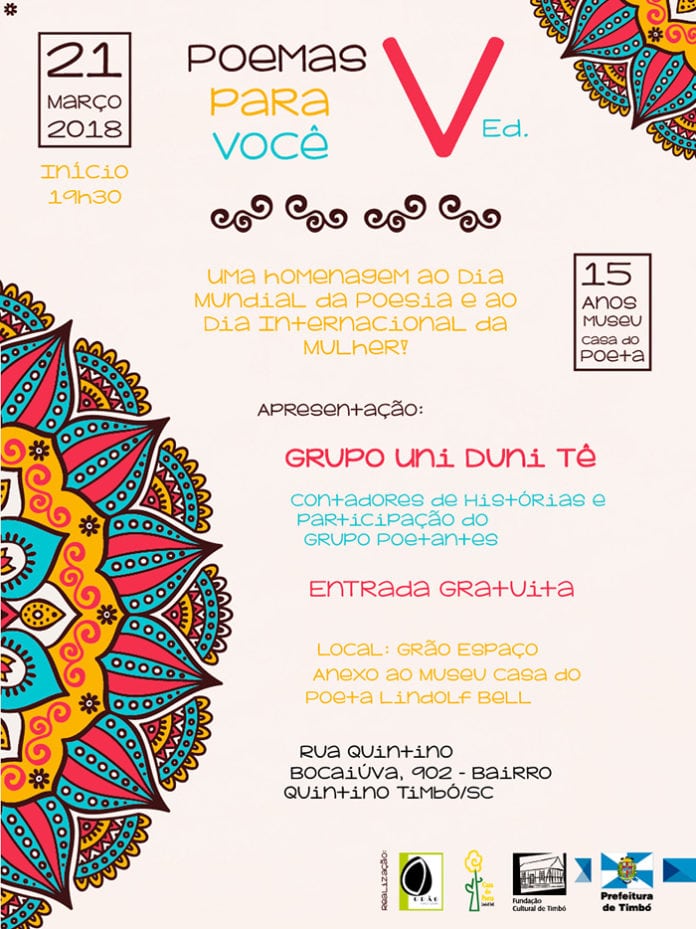 Comemorando o dia internacional da mulher e o dia mundial da poesia, a Casa do Poeta Lindolf Bell recebe no próximo dia 21 de março, a partir das 19h30, a 5ª edição do Poemas para Você. O sarau poético possui entrada gratuita e vai contar com apresentações do Grupo Uni Duni Tê Contadores de Histórias e a participação do Grupo Poetantes.
