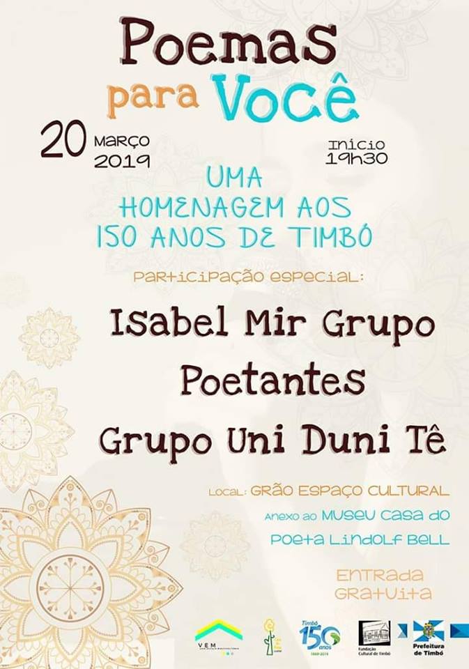 O Museu Casa do Poeta Lindolf Bell será palco de mais uma edição do “Poemas para Você”. O evento é uma homenagem aos 150 anos de Timbó e acontece no dia 20 de março, a partir das 19h30, celebrando o Dia Internacional da Mulher e o Dia Mundial da Poesia. Entre as atrações confirmadas estão o Grupo Uni Duni Tê Contadores de Histórias, Grupo Poetantes, da Escola Municipal Padre Martinho Stein, e participação especial da escritora timboense Isabel Mir.