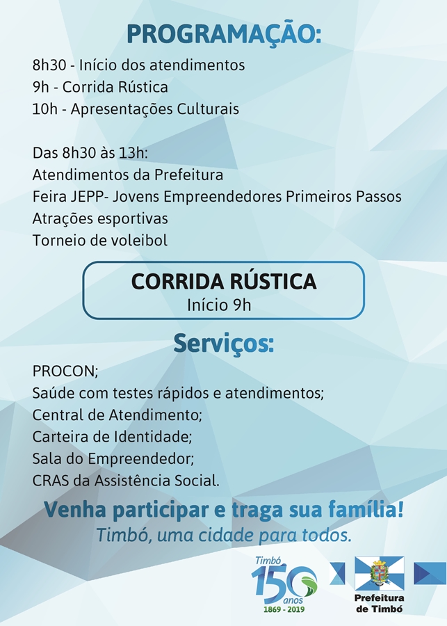 O evento no Bairro Pomeranos acontece na Escola Municipal Erwin Prade, das 8h30min às 13h. Todos os atendimentos e atrações são gratuitas. Haverá também a Corrida Rústica e um Torneio de Voleibol, sempre uma atração à parte, com início marcado para às 11h com a participação de alunos, pais, professores e a comunidade em geral.