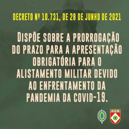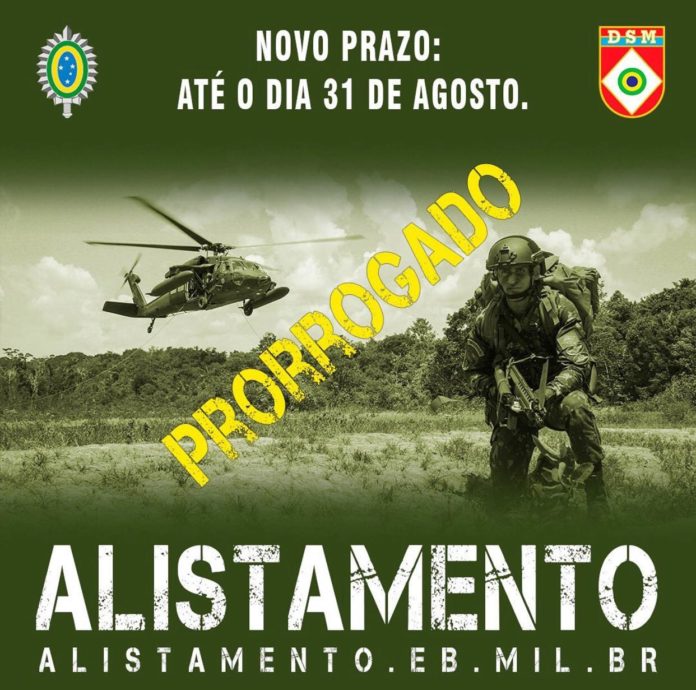 O prazo para o Alistamento Militar foi prorrogado para o dia 31 de agosto, conforme Decreto Federal Nº 10.731, desta segunda-feira, dia 28 de junho. Devem realizar o alistamento neste ano jovens do sexo masculino que nasceram em 2003.