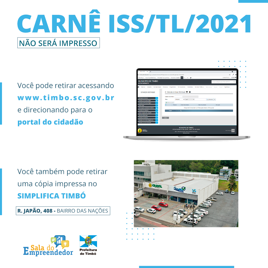 O carnê pode ser retirado no site da Prefeitura, no Portal do Cidadão, acesse aqui. Para quem não conseguir, pode solicitar pelo WhatsApp, através do (47) 98498-1610, ou ainda, retirar uma cópia impressa no Simplifica Timbó, localizado na rua Japão, nº 408, bairro das Nações. O atendimento é de segunda a sexta-feira, das 8h às 17h (sem fechar para o almoço).