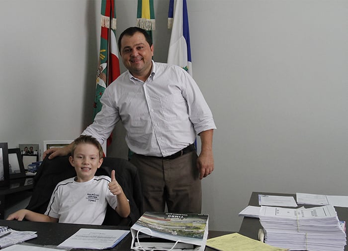 O prefeito agradeceu o carinho do garoto e o presenteou com duas bolsas personalizadas da Prefeitura de Timbó, contendo um livro da história da cidade, chaveiro, mapa turístico e outras lembranças. Uma das bolsas o prefeito sugeriu que o estudante sorteie entre os amigos da escola.