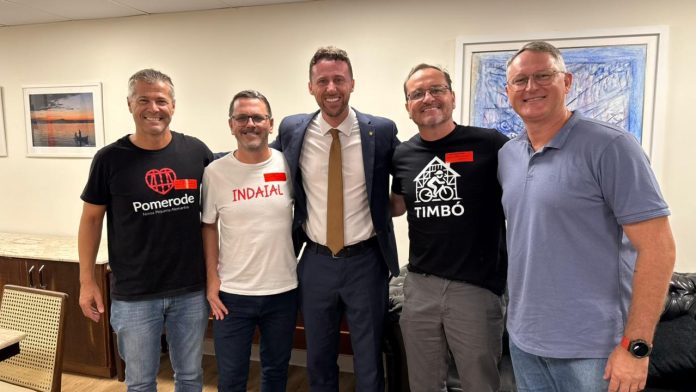Os prefeitos de Timbó, Pomerode e Indaial estiveram em Florianópolis nesta terça-feira, dia 24, para uma agenda conjunta voltada ao fortalecimento do esporte regional. Na Assembleia Legislativa de Santa Catarina, os prefeitos Flávio Buzzi, Rafael Ramthum e Silvio César da Silva se reuniram com o deputado estadual Fernando Krelling e com o gerente de Esportes de Rendimento da FESPORTE, Selvino Anderson.