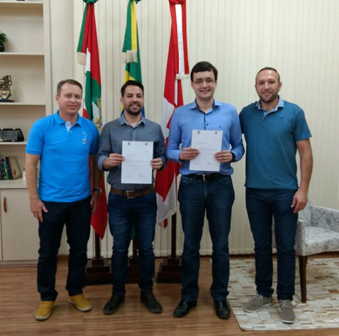 Na manhã desta quinta-feira, dia 28 de setembro, o Prefeito de Timbó Jorge Kruger e o Diretor Presidente da Fundação Municipal de Esportes FME Marcio Elísio estiveram no gabinete do Prefeito de Indaial André Moser, acompanhado pelo Diretor Presidente da FME Indaial Marcio Moisés Selhorst, para assinatura do termo de intenção para sediar em 2018 a etapa estadual da OLESC, e em 2019 os Jogos Abertos de Santa Catarina – JASC, os mais importantes do estado.