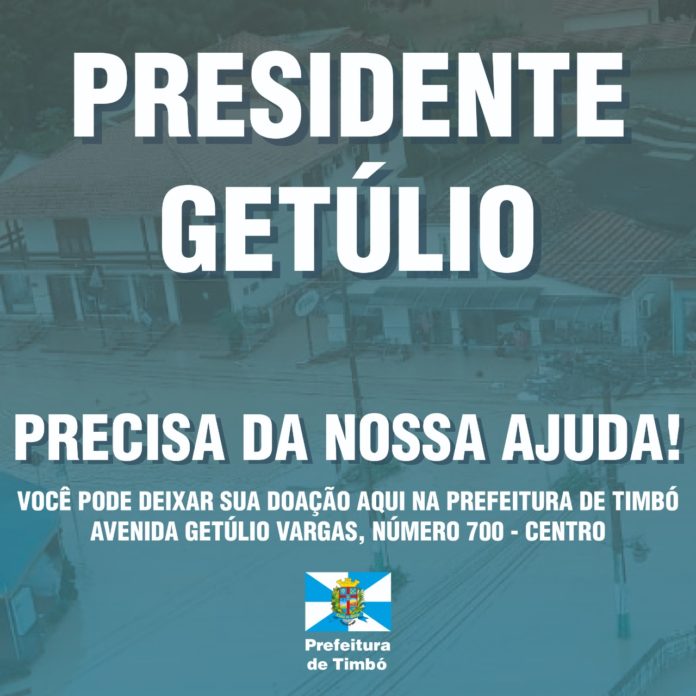 A Prefeitura de Timbó está mobilizando uma ação para arrecadar donativos para o município de Presidente Getúlio. No momento, segundo a Defesa Civil da cidade, o que as pessoas mais estão precisando são doações de alimentos, produtos de limpeza e higiene.