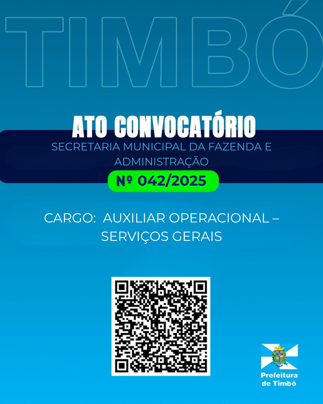 A Secretaria Municipal da Fazenda e Administração de Timbó anuncia a convocação de candidatos para o preenchimento de vagas temporárias, conforme estabelecido no Ato Convocatório nº 042/2025, vinculado ao Edital de Chamada Pública Suplementar nº 03/2024.