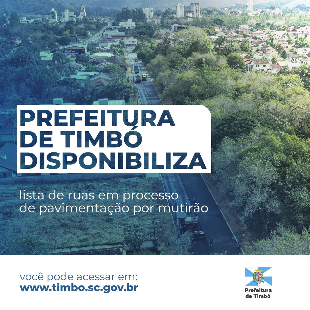 A Prefeitura de Timbó informa que, de acordo com a Lei Municipal nº 3244, de 02 de setembro de 2021, as ruas cadastradas para futura execução de obras de pavimentação de vias públicas e calçamento de passeios públicos no sistema de mutirão estão disponíveis para consulta no site da Prefeitura, aqui.
