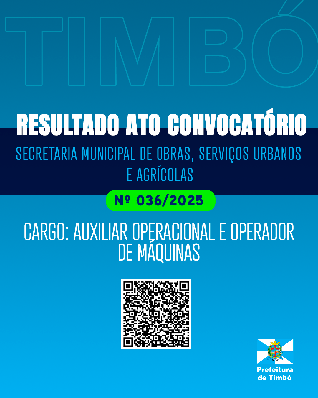 Prefeitura de Timbó divulga resultado final de processo seletivo para Auxiliar Operacional e Operador de Máquinas na Secretaria Municipal de Obras, Serviços Urbanos e Agrícolas