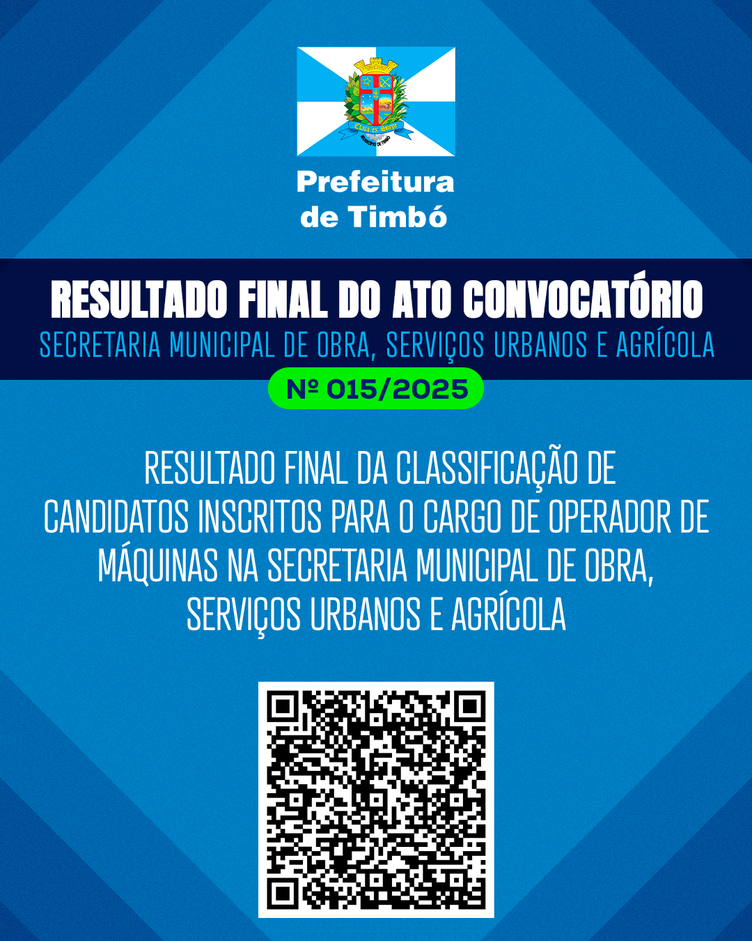 A SECRETARIA MUNICIPAL DE OBRA, SERVIÇOS URBANOS E AGRÍCOLA torna público o resultado final do Ato Convocatório nº 015/2025, vinculado ao Edital de Chamada Pública Suplementar nº 03/2024. A seleção, realizada no dia 14 de março de 2025, definiu a classificação dos candidatos inscritos para o cargo de Operador de Máquinas.
