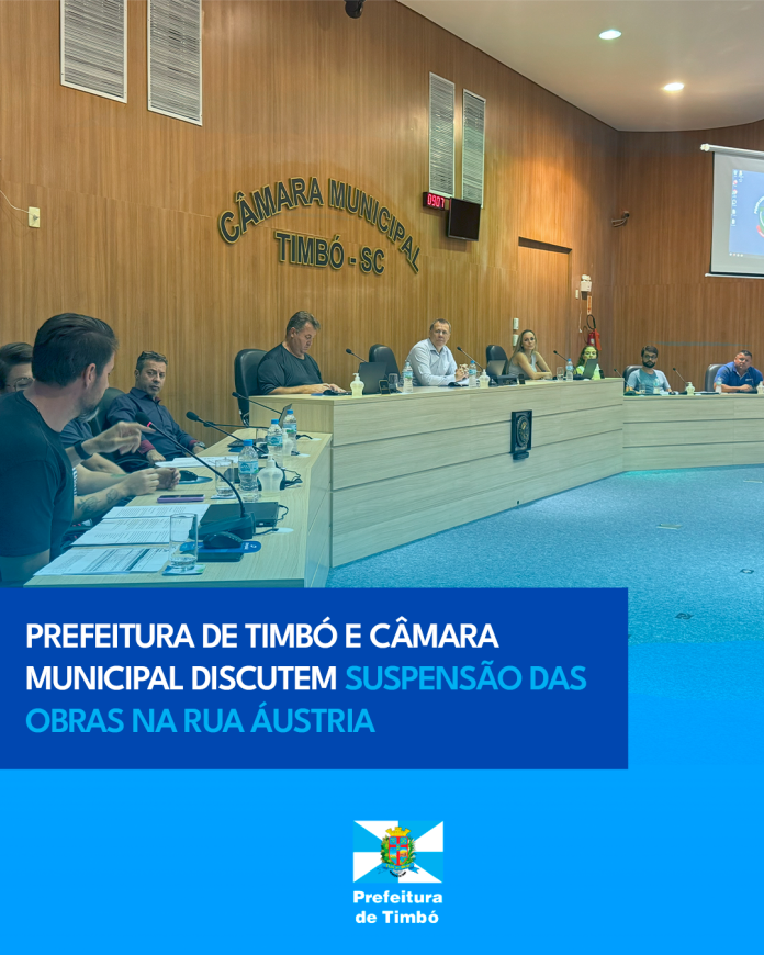 A Prefeitura de Timbó, juntamente com vereadores e representantes da comunidade, realizou uma reunião para discutir a suspensão das obras de drenagem pluvial da Bacia da Rua Áustria. A paralisação foi determinada após recomendação da 3ª Promotoria de Justiça da Comarca de Timbó, que instaurou procedimento para apurar possíveis irregularidades na execução do contrato firmado com a empresa responsável.
