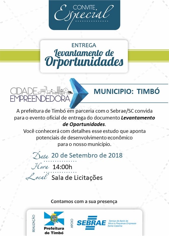A Prefeitura de Timbó, em parceria com o Sebrae/SC, convida a todos para o evento oficial de entrega do documento de Levantamento de Oportunidades. Na ocasião, os presentes irão conhecer detalhes de como o estudo que aponta potenciais de desenvolvimento econômico para o nosso município aconteceu. O evento acontece no dia 20 de setembro, às 14h, na sala de licitações, piso térreo da Prefeitura.