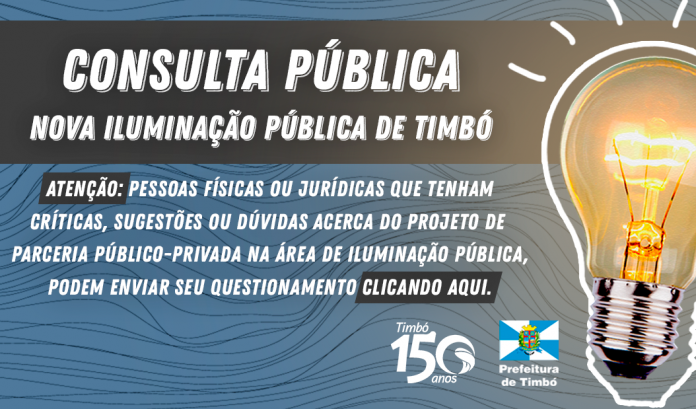 A Prefeitura de Timbó está realizando uma consulta pública on-line, no seu próprio site, para saber qual a opinião das pessoas acerca da nova Parceria Público-Privada (PPP) para implementação uma iluminação pública mais eficiente e barata. Para participar, os interessados podem ler os editais e contratos da PPP da Iluminação Pública no site www.timbo.sc.gov.br. A consulta é aberta e está disponível para receber a opinião de pessoas residentes em Timbó e de fora do município também.
