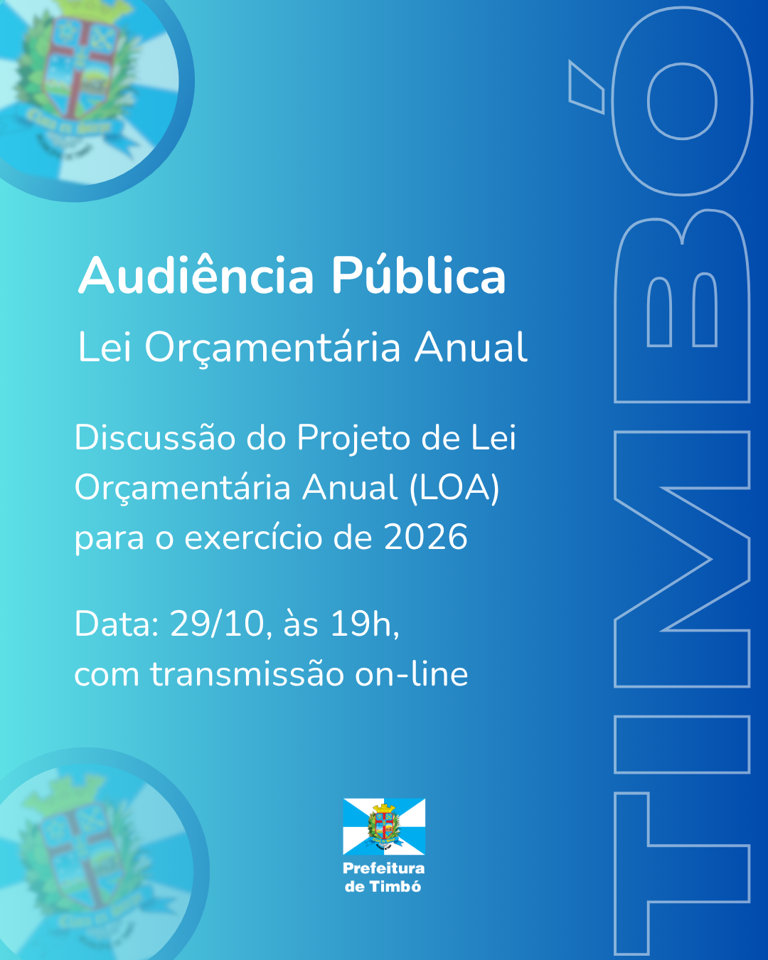 A Prefeitura de Timbó convida a comunidade para participar da audiência pública que apresentará e discutirá o Projeto da Lei Orçamentária Anual (LOA) para o exercício de 2026. O encontro acontecerá no dia dia 29 de outubro, terça-feira, às 19h, no auditório da Prefeitura de Timbó, com transmissão ao vivo pelo canal oficial da Prefeitura no YouTube.