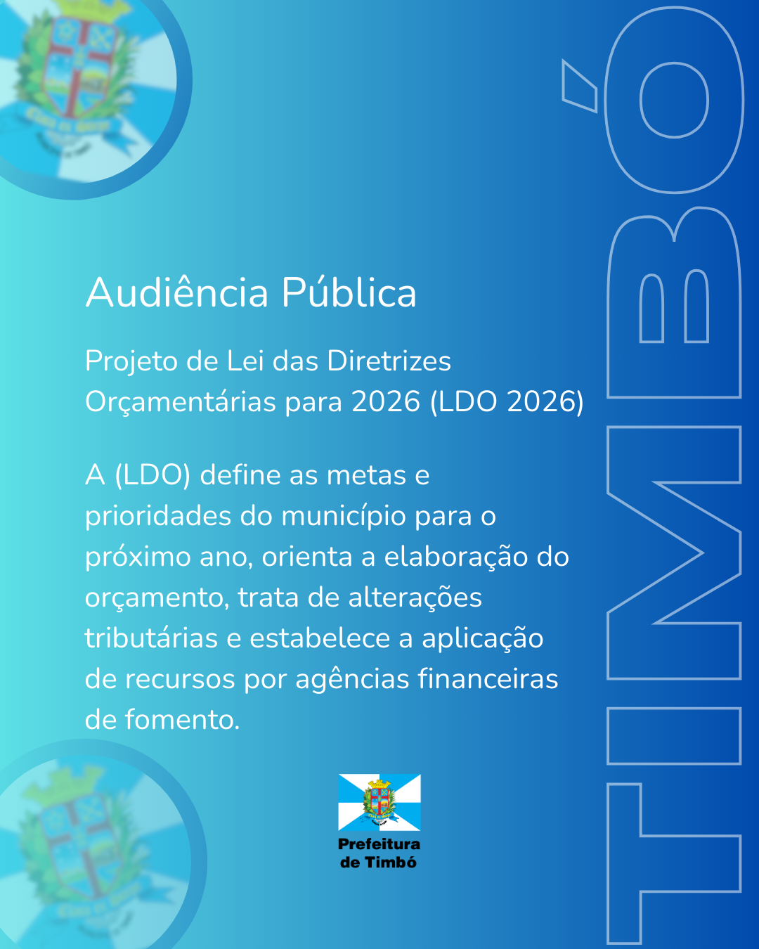 No dia 28 de agosto, quinta-feira, a Prefeitura de Timbó, por meio da Secretaria da Fazenda e Administração, promove Audiência Pública para apresentação e discussão do Projeto de Lei das Diretrizes Orçamentárias para 2026 (LDO 2026). Toda a comunidade timboense está convidada a participar.