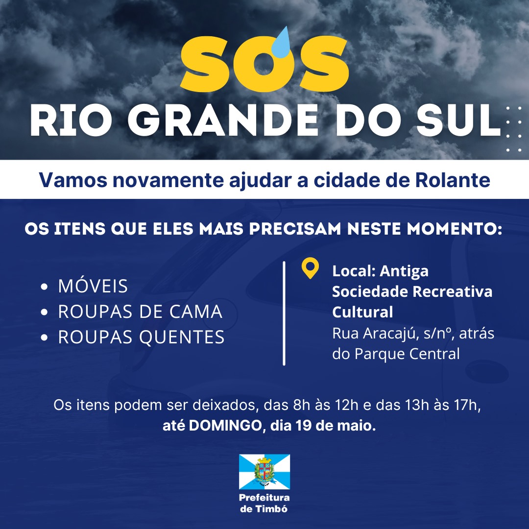 A Prefeitura de Timbó segue ajudando e se solidarizando com o Rio Grande do Sul. Por isso, está promovendo uma nova campanha de arrecadação de donativos para Rolante, município que a Prefeitura de Timbó adotou.