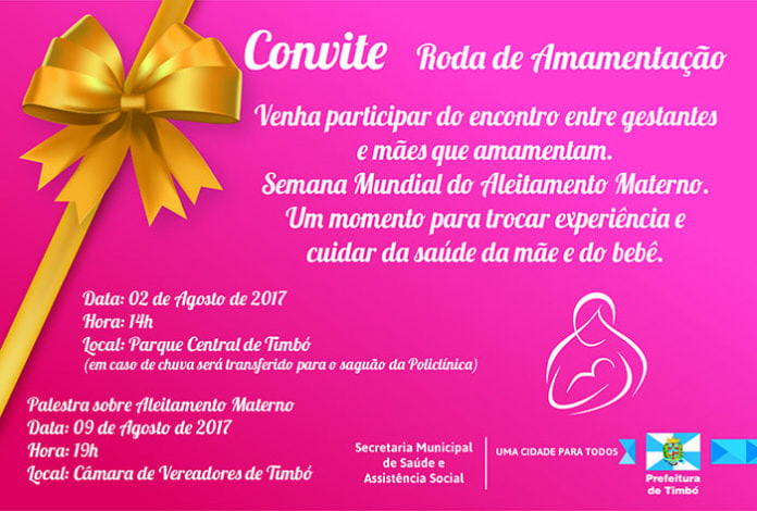 No dia 9 de agosto, quarta-feira, a partir das 13h, na Câmara Municipal, a Prefeitura de Timbó através da Secretaria de Saúde irá realizar palestras em comemoração a Semana do Aleitamento Materno. A ação teve início no dia 2 com a roda de amamentação que reuniu mais de 60 pessoas no Parque Central.
