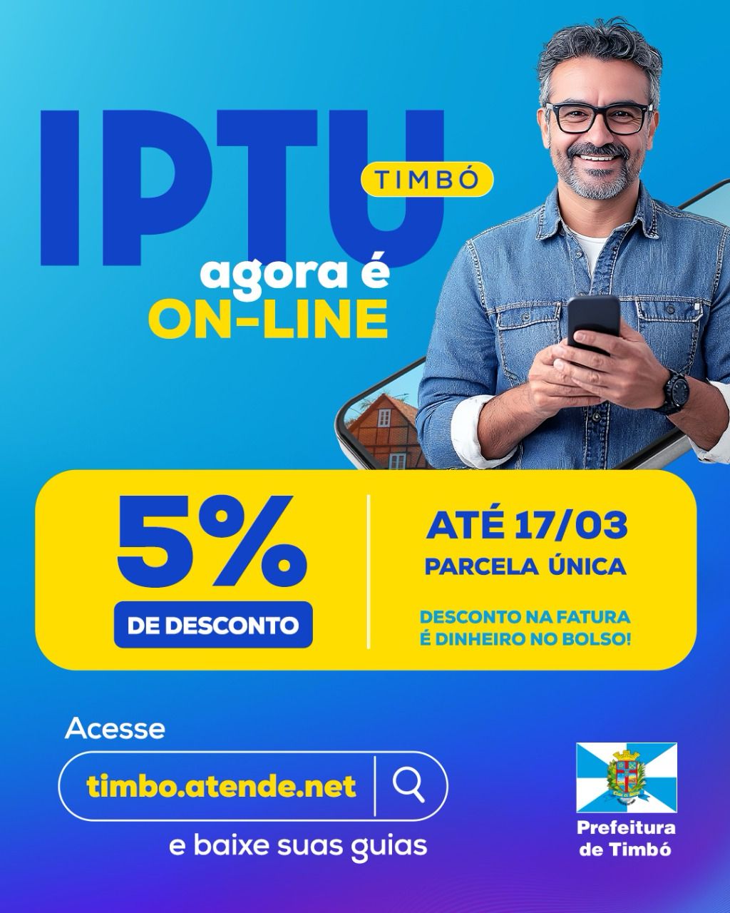 A Prefeitura de Timbó lembra aos contribuintes que a primeira data de vencimento do IPTU 2025 está marcada para a próxima segunda-feira, 17 de março. Quem optar pelo pagamento integral antecipado até essa data garante um desconto de 5%, uma economia direta no orçamento familiar.