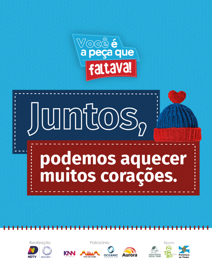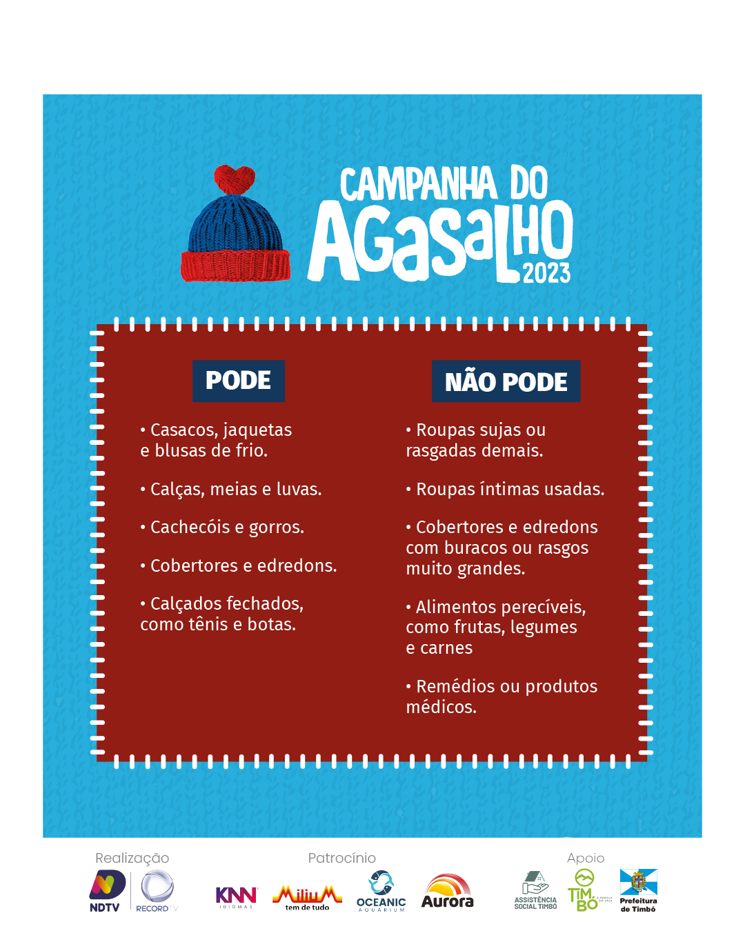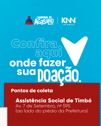 A Prefeitura de Timbó está apoiando a Campanha do Agasalho 2023, promovida pela NDTV Record TV. Por isso, há um ponto de coleta de casacos, calças, cobertores, edredons e outras roupas de frio na Assistência Social do município, localizada na Av. 7 de Setembro, nº 595 (ao lado do prédio da Prefeitura).