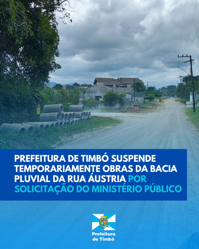 A Prefeitura de Timbó recebeu, no dia 26 de fevereiro, um ofício do Ministério Público de Santa Catarina sugerindo a suspensão momentânea das obras na Rua Áustria e vias adjacentes para a realização de uma vistoria técnica e esclarecimentos sobre possíveis irregularidades na obra de drenagem.