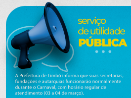 Serviço de Utilidade Pública Prefeitura de Timbó manterá expediente normal durante o feriado de Carnaval