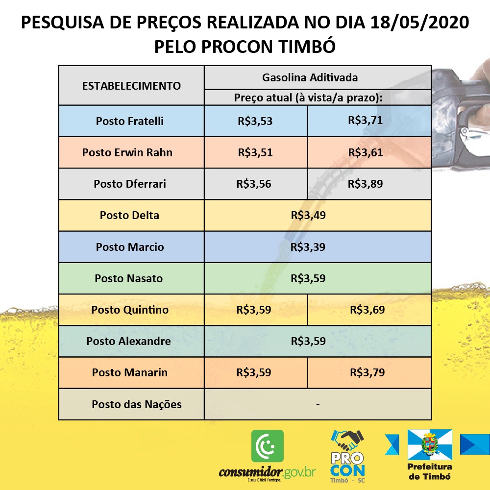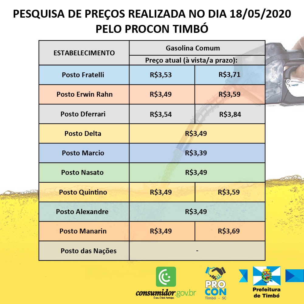 O Procon de Timbó divulgou o levantamento dos preços de combustíveis nos 10 estabelecimentos que oferecem esse serviço no município. Os dados foram levantados na última semana e essa fiscalização acontece com frequência, tendo como finalidade confirmar se houve reajustes nos valores.