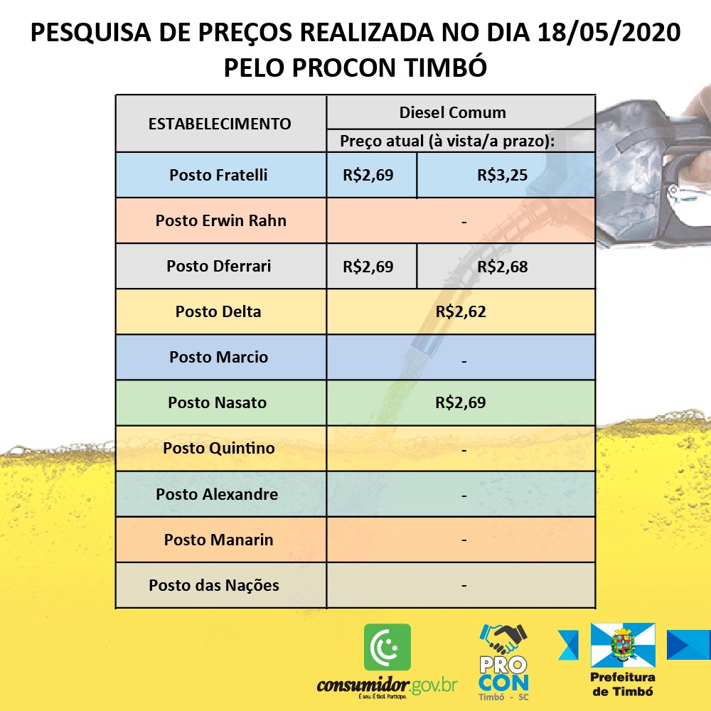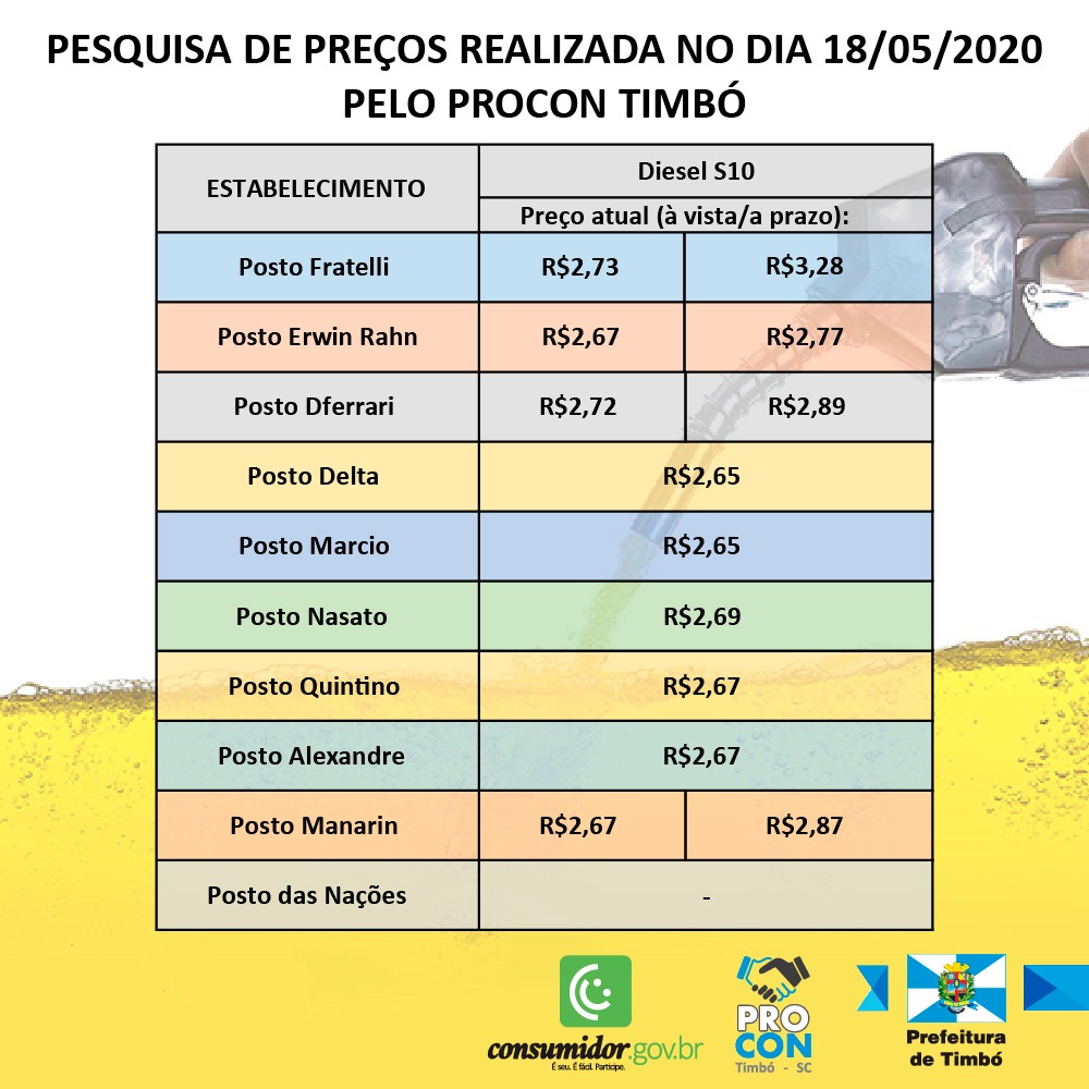 O Procon de Timbó divulgou o levantamento dos preços de combustíveis nos 10 estabelecimentos que oferecem esse serviço no município. Os dados foram levantados na última semana e essa fiscalização acontece com frequência, tendo como finalidade confirmar se houve reajustes nos valores.