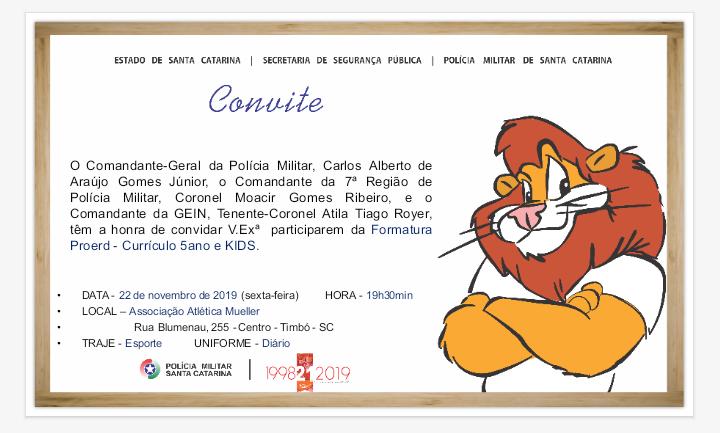 Acontece nesta sexta-feira, 22, a partir das 19h30min, no ginásio da Associação Atlética Müller, a tão esperada formatura do Proerd em Timbó, para estudantes de 5º ano e turmas kids, uma inovação do programa para faixa etária de 7 e 8 anos. Em 2019, serão 515 crianças das escolas municipais, estaduais e particulares de nossa cidade que recebem seu certificado de atores contra as drogas e a violência. O programa da Polícia Militar, que tem o apoio do Poder Público Municipal, completa este ano sua maioridade, sendo realizado a 21 anos em Timbó.