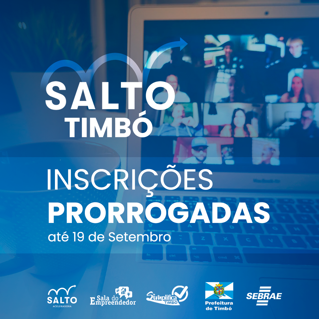 Realizado pela Prefeitura de Timbó em parceria com o Sebrae/SC, o Salto tem o objetivo de oportunizar capacitação empreendedora, focada no autodesenvolvimento do empreendedor e no crescimento do seu negócio. As inscrições, que inicialmente seriam até o dia 09 de setembro, foram prorrogadas até o dia 19 de setembro.
