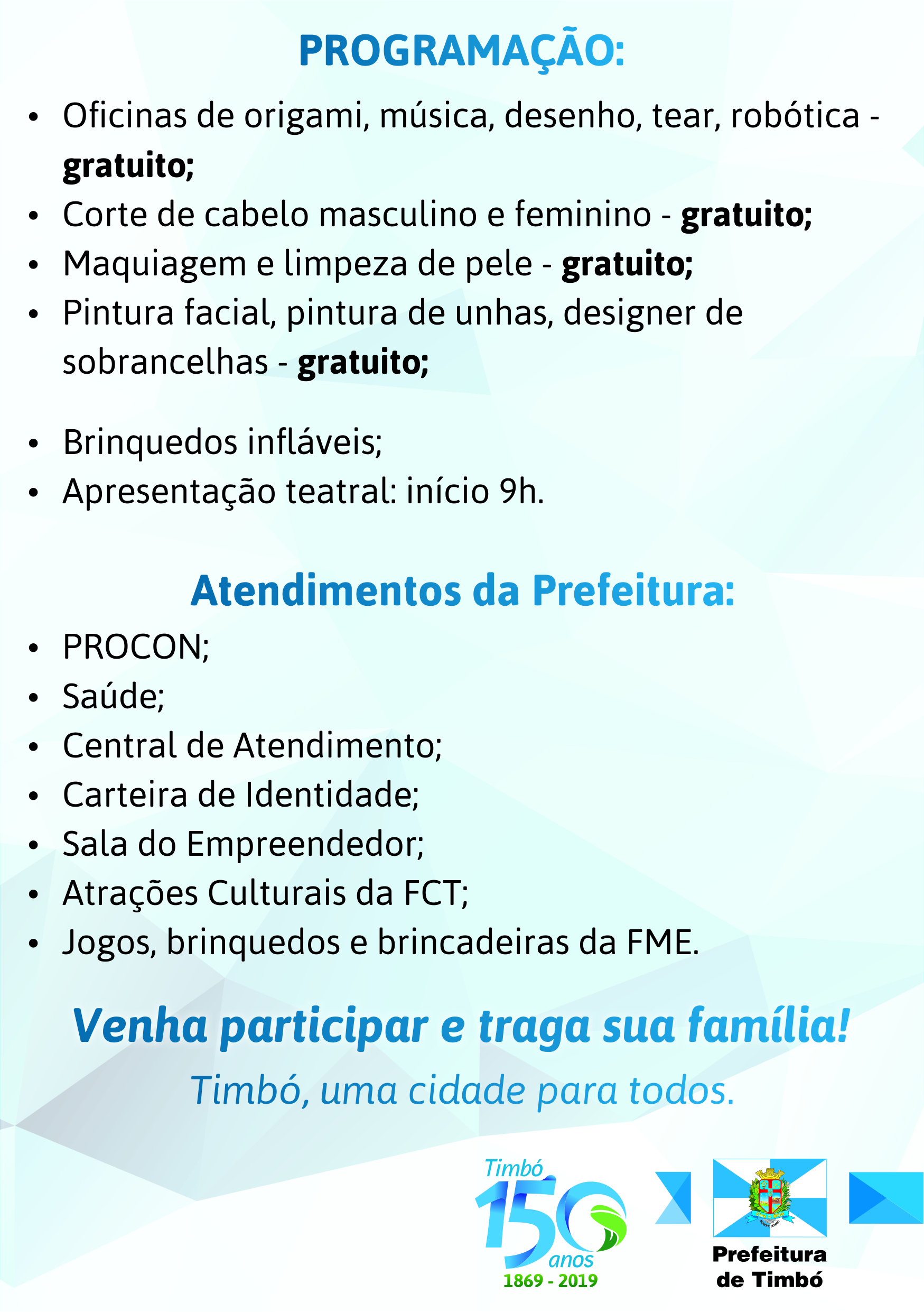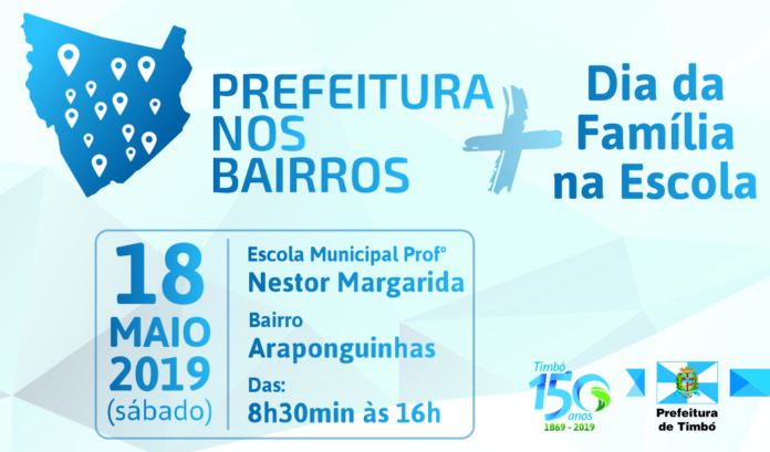 O Programa Prefeitura nos Bairros estreia neste sábado, 18 de maio, das 8h30 às 16h, na Escola Municipal Profº Nestor Margarida, bairro Araponguinhas. Confira a programação no site: www.timbo.sc.gov.br.