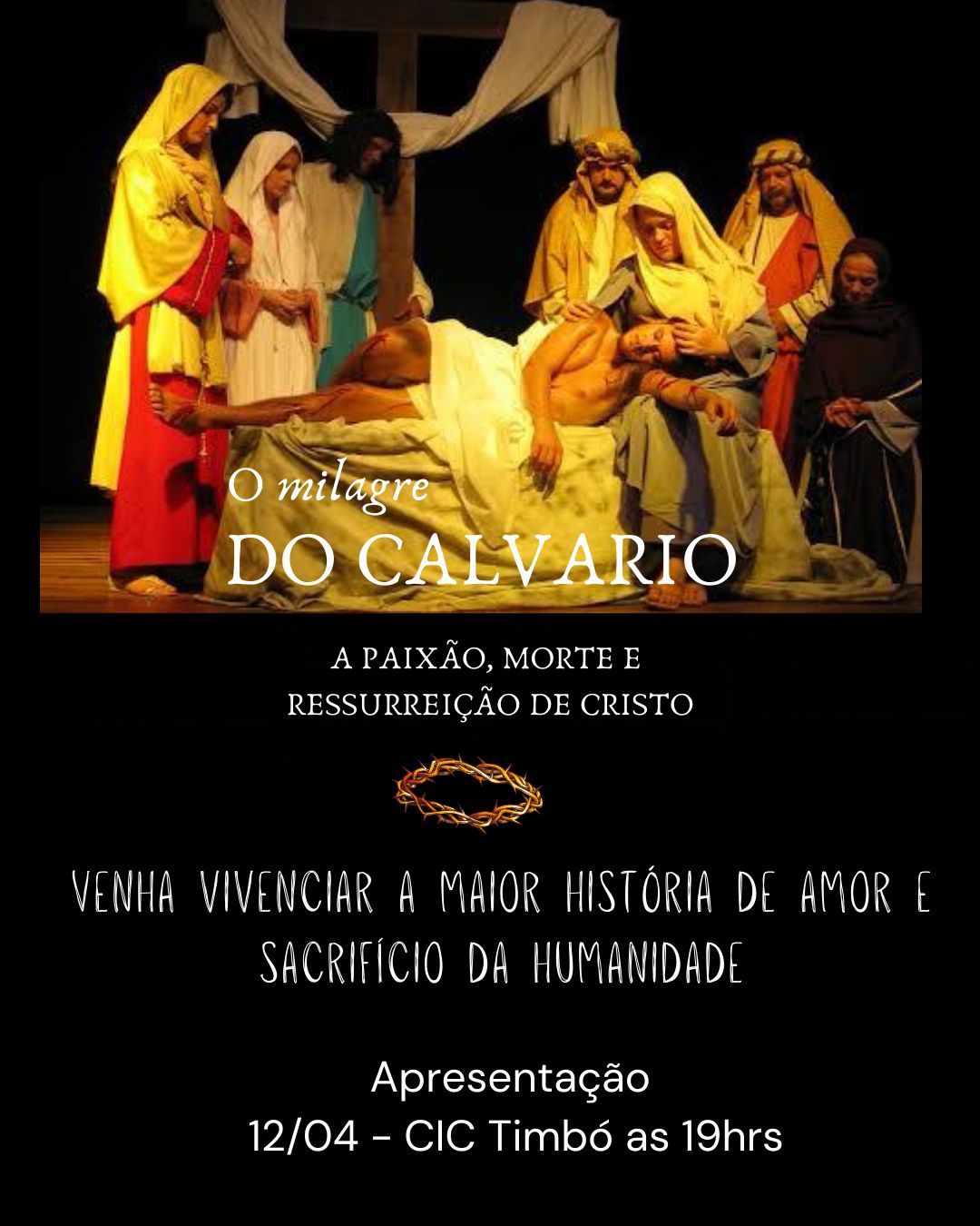 A cidade de Timbó convida a comunidade para um dos momentos mais simbólicos e emocionantes da sua programação de Páscoa: a encenação do espetáculo de teatro “O Milagre do Calvário”, que acontece neste sábado, 12 de abril, às 19h, no Teatro do Centro Integrado de Cultura (CIC). A entrada é gratuita.
