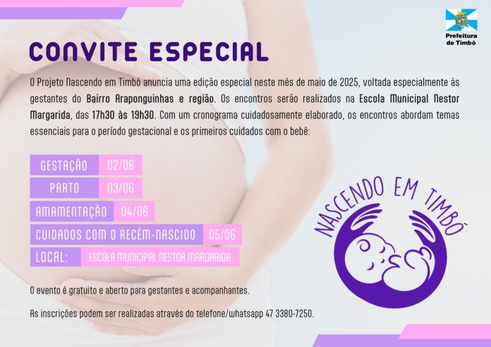 Proporcionando um espaço de acolhimento, informação e segurança para as gestantes da cidade, o Projeto Nascendo em Timbó anuncia uma edição especial neste mês de maio de 2025, voltada especialmente às gestantes do Bairro Araponguinhas e região. Os encontros serão realizados na Escola Municipal Nestor Margarida, das 17h30 às 19h30.