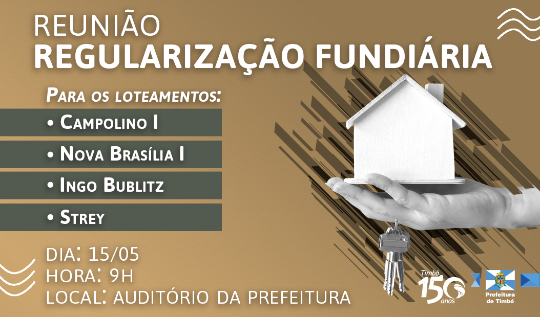 A Secretaria de Planejamento, Trânsito, Meio Ambiente, Comércio e Serviços da Prefeitura de Timbó convida todos os contribuintes e moradores dos loteamentos Campolino I, Nova Brasília I, Ingo Bublitz e Strey a participarem da Reunião De Regularização Fundiária. A reunião acontece nesta quarta-feira, 15 de maio, às 09h, no Auditório da Prefeitura de Timbó.