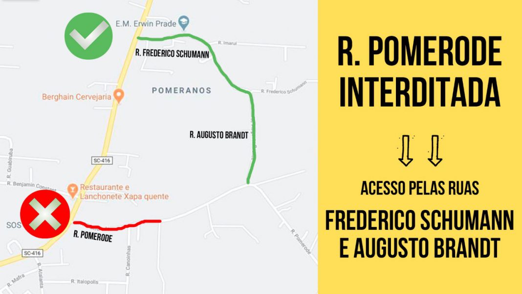 Rua Pomerode tem o acesso interditado durante o dia de hoje, 20, para regularização do terreno no início da via, uma manobra técnica importante para estabelecer o nível da rua conforme o projeto de execução para a pavimentação. A área está sinalizada com placas e materiais de isolamento para que não haja acesso de veículos. A opção de desvio é via ruas Augusto Brandt (sentido bairro – centro) e rua Frederico Schumann, que é da Escola Erwin Prade (sentido centro – bairro).