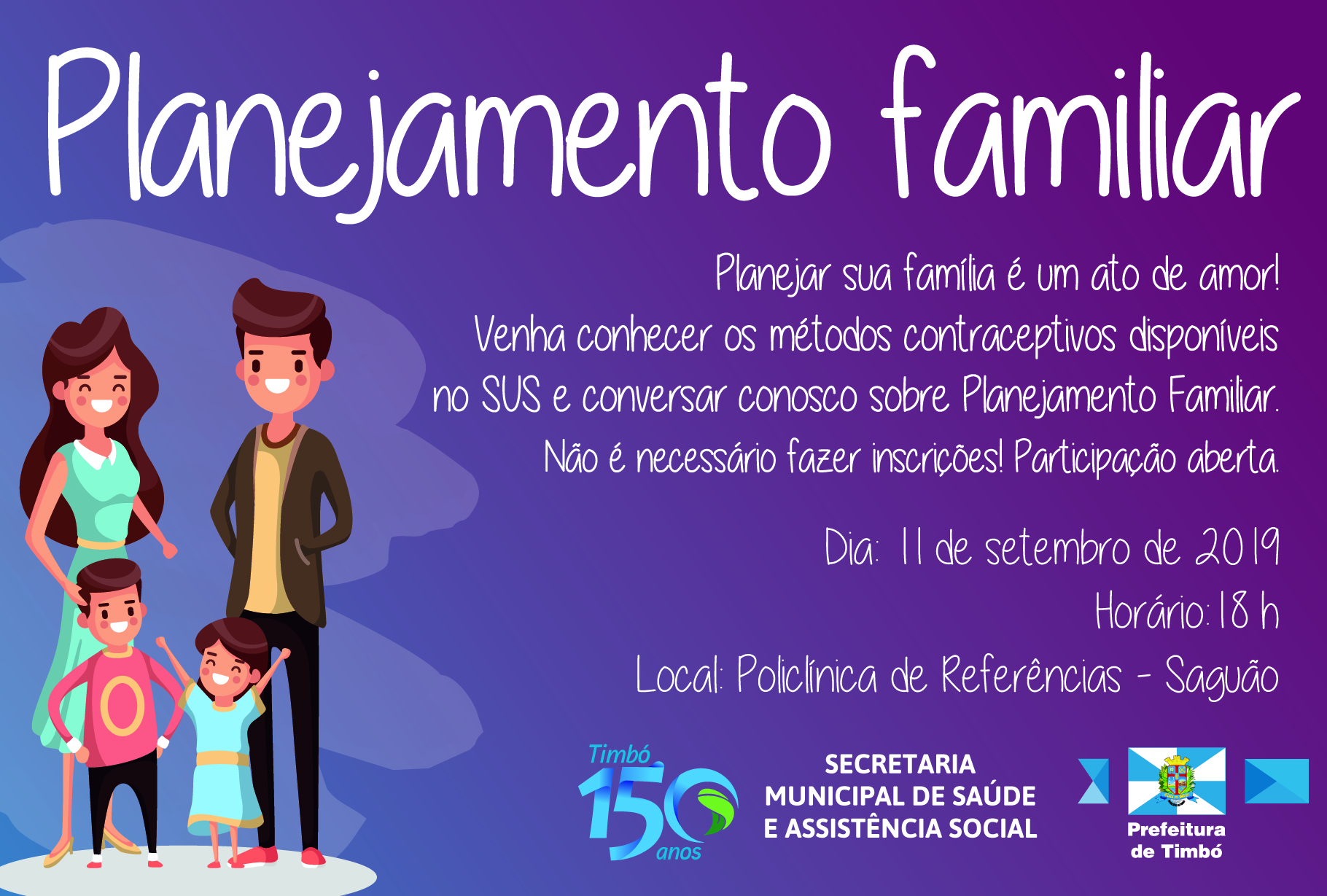 Acontece amanhã (11) o Grupo de Planejamento Familiar, no salão da Policlínica de Referencias de Timbó, às 18h. O grupo é para casais que desejam planejar suas famílias. São rodas de conversa que discutem os métodos contraceptivos disponíveis no SUS, em que as pessoas podem tirar dúvidas e contar suas experiências.
