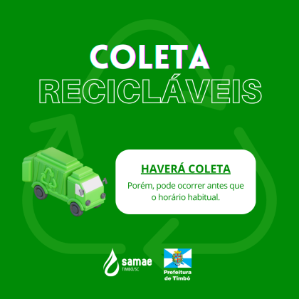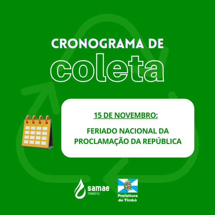 O SAMAE Timbó informa que a coleta de resíduos será realizada normalmente. No entanto, devido ao feriado da Proclamação da República nesta sexta-feira, dia 15 de novembro, o caminhão de coleta poderá passar mais cedo que o habitual.