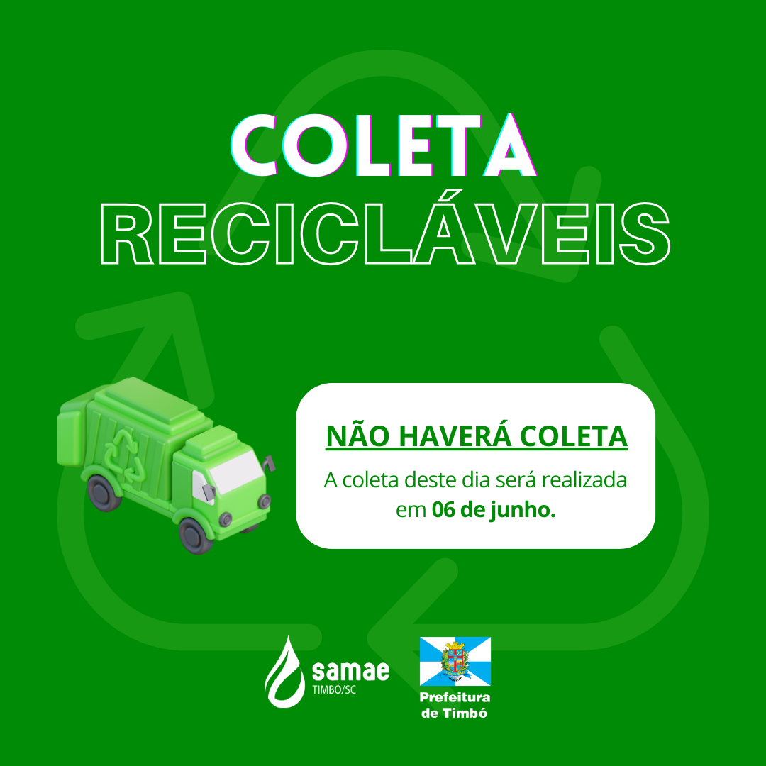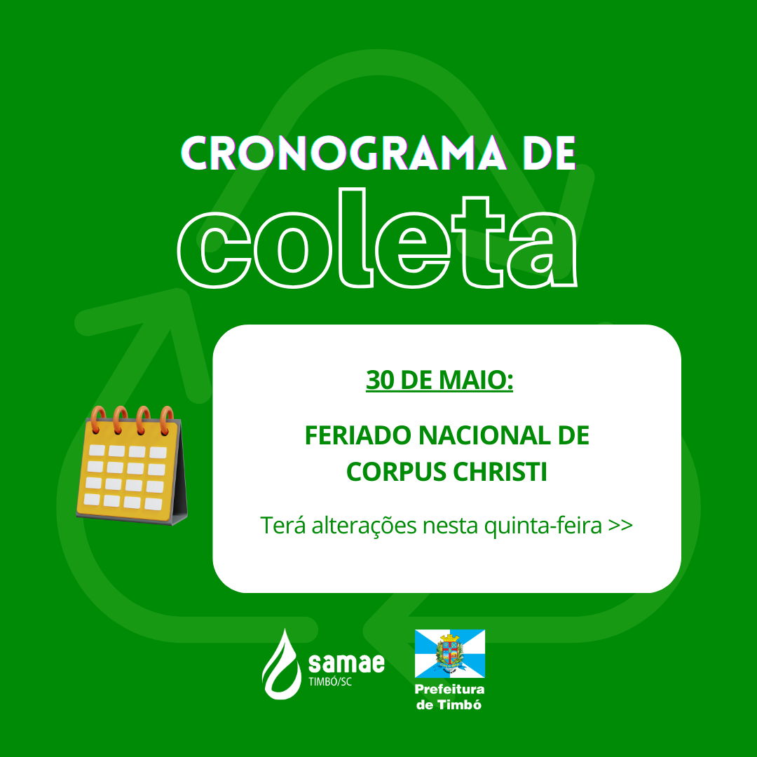 O SAMAE Timbó informa que, devido ao Feriado Nacional de Corpus Christi nesta quinta-feira, dia 30 de maio, o cronograma de coletas no município de Timbó irá ter alterações:
