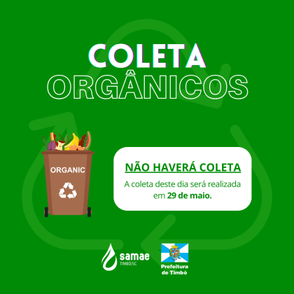 NÃO HAVERÁ coleta de resíduos orgânicos. A coleta deste dia será ANTECIPADA para 29 de maio, próxima quarta-feira. Bairros Centro, Capitais, Tiroleses, Nações e Imigrantes.