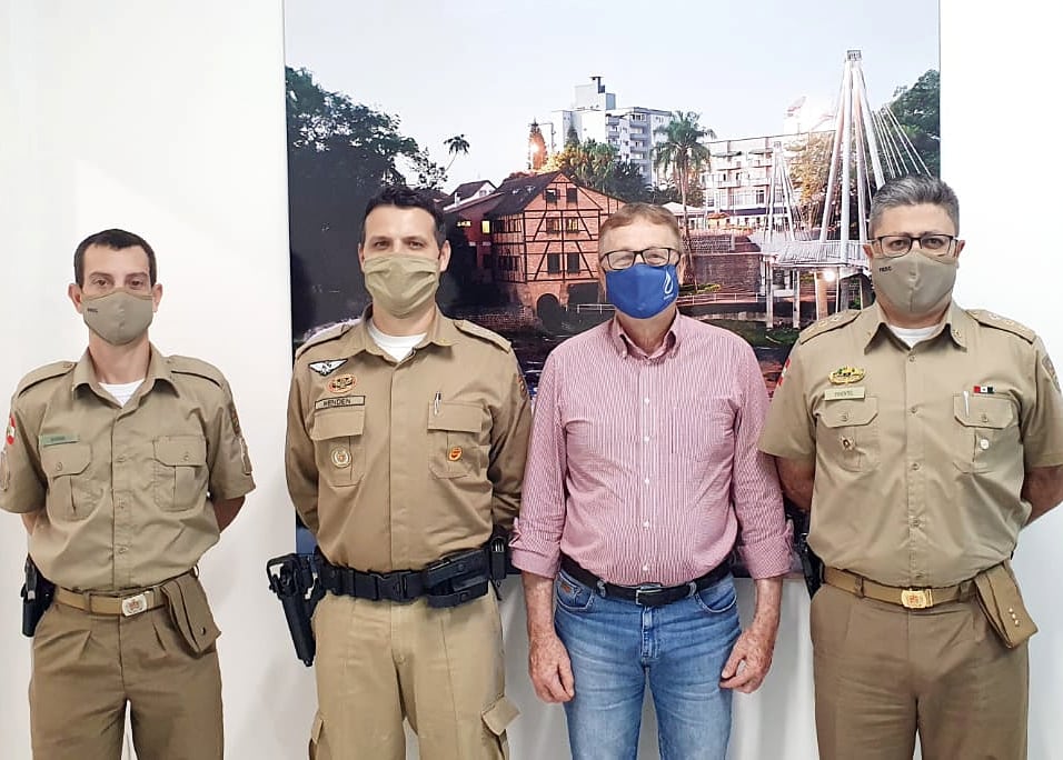 O Presidente do SAMAE Timbó, Waldir Girardi, se reuniu junto ao Major Pablo Davi Henden, que está à frente do comando da Guarnição Especial de Indaial (GEIn); o Tenente-Coronel Pimentel, Chefe do Estado Maior da 7ª Região de Polícia Militar e o Soldado Eugênio responsável, técnico da Central Regional de Emergência da 7ª Região de Polícia Militar.