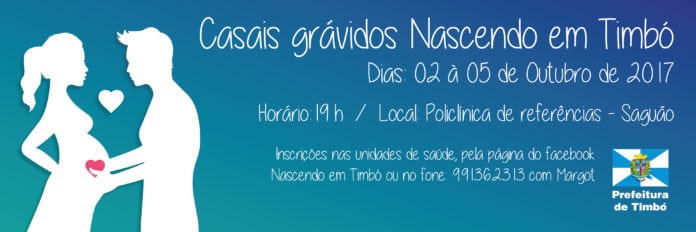 Nos dias 2 a 5 de outubro, a Prefeitura de Timbó através da Secretaria de Saúde irá realizar uma nova edição do evento Casais Grávidos Nascendo em Timbó, a partir das 19h, no saguão da Policlínica. O evento é gratuito e tem o objetivo de sanar dúvidas, compartilhar experiências e orientar os casais sobre os desafios do nascimento.