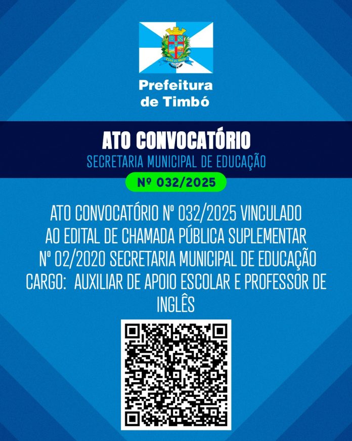 A Secretaria Municipal de Educação de Timbó anuncia mais uma convocação de candidatos para preenchimento de vagas temporárias para os cargos de Professor de Inglês e Auxiliar de Apoio Escolar, conforme estabelecido no Edital de Chamada Pública Suplementar n° 02/2020.
