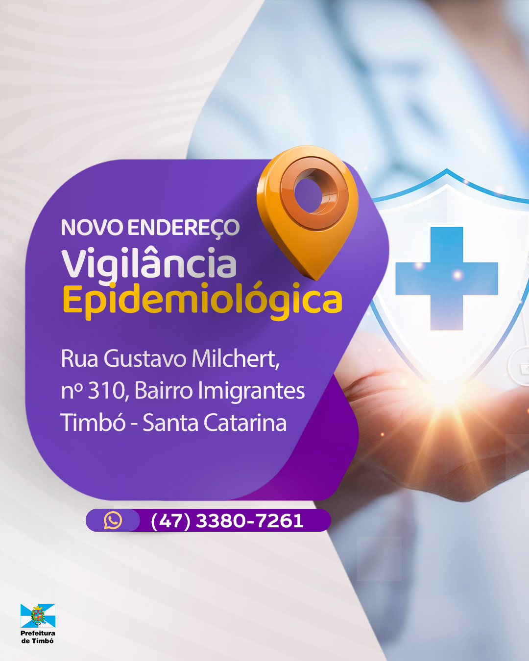 A Secretaria Municipal de Saúde de Timbó informa à comunidade que, a partir da próxima terça-feira, 22 de abril, o Setor de Vigilância Epidemiológica estará atendendo em novo endereço.