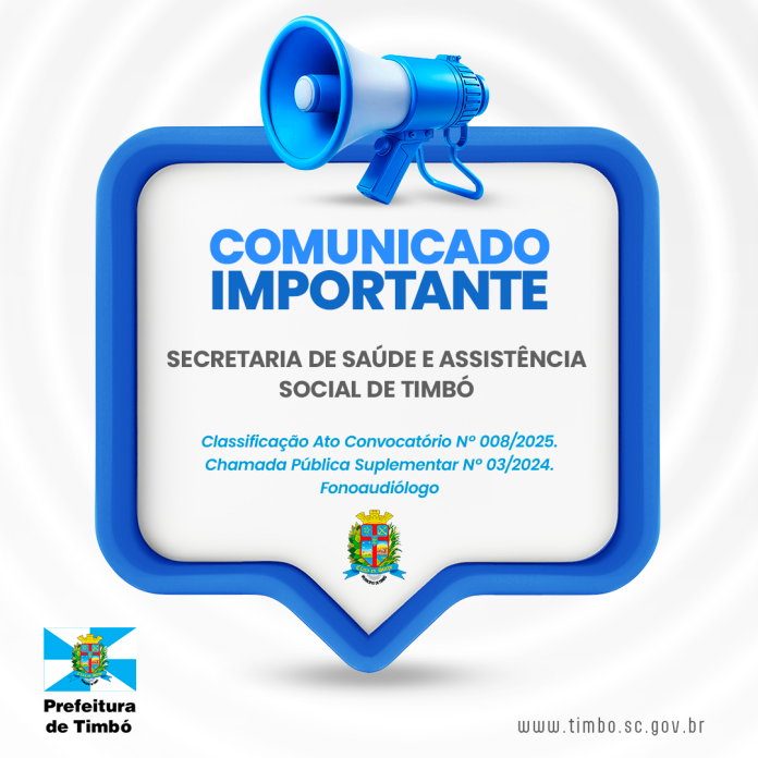 A Prefeitura de Timbó, por meio da Secretaria Municipal de Saúde e Assistência Social, divulgou nesta segunda-feira (24) o resultado final do Ato Convocatório nº 008/2025, vinculado ao Edital de Chamada Pública Suplementar nº 03/2024. A seleção foi realizada no dia 17 de fevereiro de 2025 e definiu a classificação para o cargo de Fonoaudiólogo.