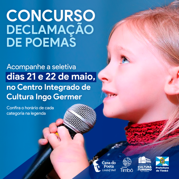 O 14º Concurso de Declamação de Poemas de Timbó chega a mais uma etapa. Com mais de 250 inscrições, nesta terça e quarta-feira, dia 21 e 22 de maio, acontecem as seletivas. Serão selecionadas cinco pessoas de cada categoria.