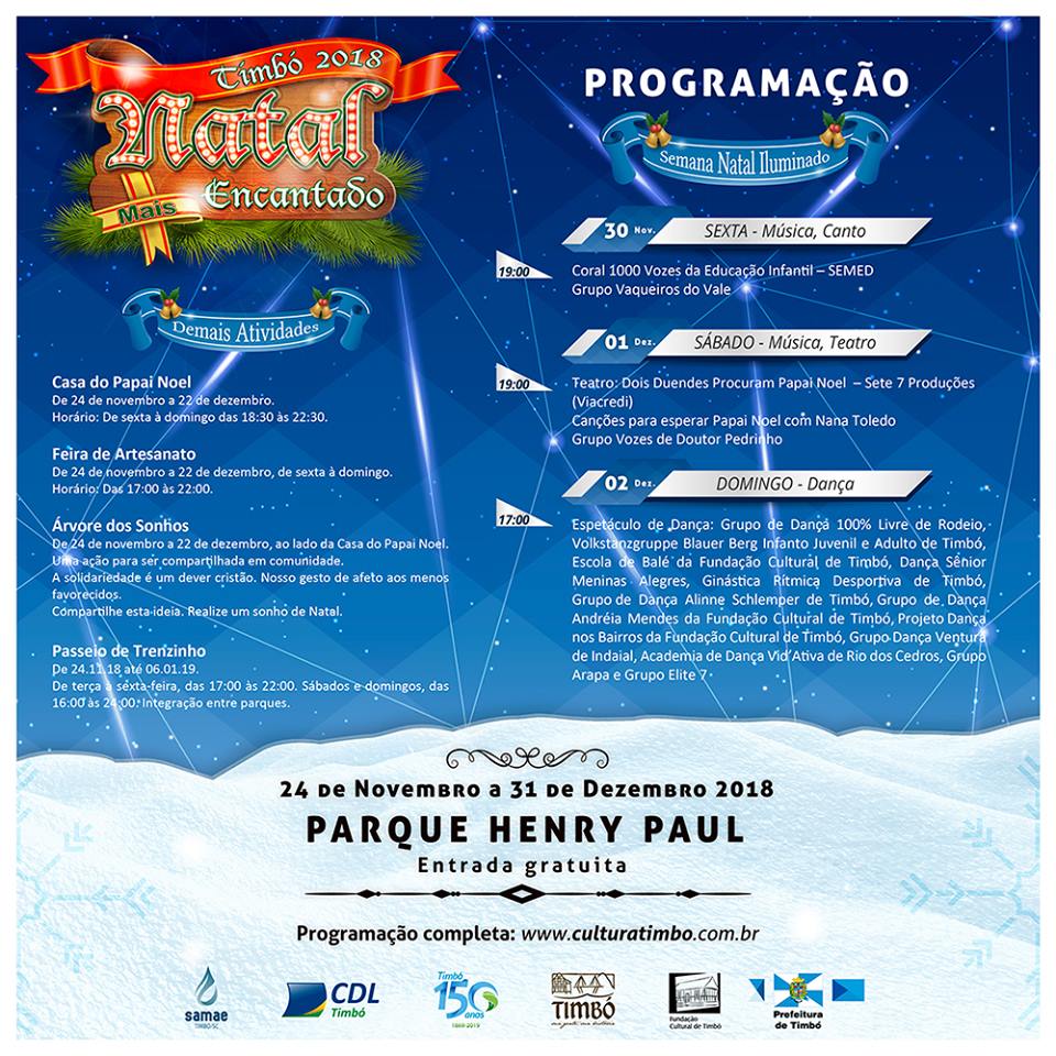 Apresentações musicais, espetáculos teatrais e de dança irão marcar a Semana Natal Iluminado, a partir de sexta-feira, dia 30, no Parque Henry Paul. A programação é gratuita e faz parte do Natal Mais Encantado de Timbó, evento promovido pela Prefeitura e Fundação Cultural de Timbó.