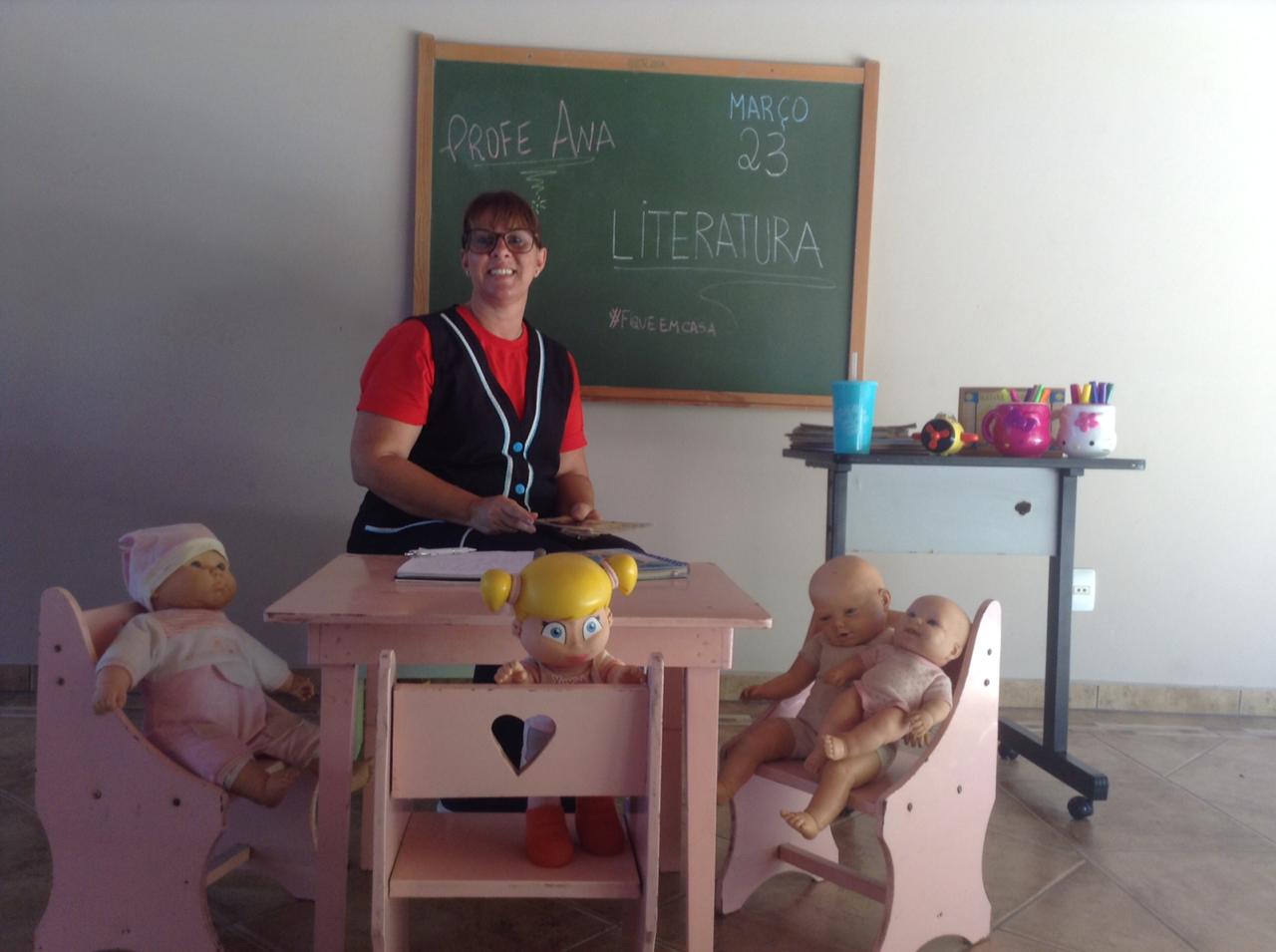 Na foto podemos ver um exemplo de como iniciativas assim já estão fazendo a diferença. A professora Ana Paula Bogochewski Kalinowski, que leciona na Escola São Roque, montou um estúdio muito lúdico em casa, onde grava vídeos didáticos que são encaminhados aos alunos e pais.