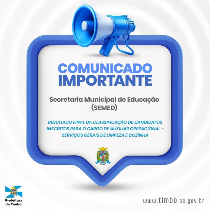 A Secretaria Municipal de Educação (SEMED) torna público o resultado final da classificação dos candidatos inscritos para o cargo de Auxiliar Operacional – Serviços Gerais de Limpeza e Cozinha.