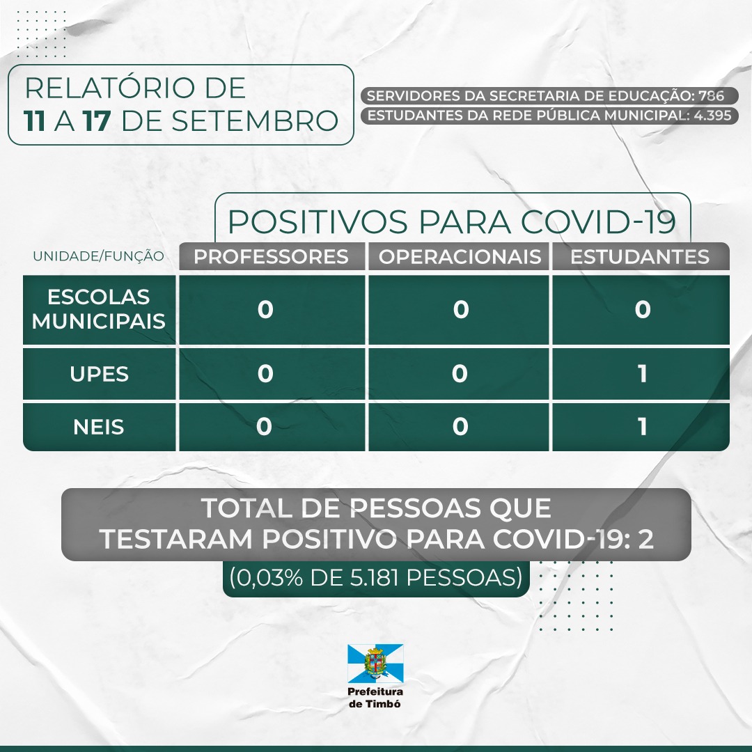 Prezando pela transparência na divulgação dos dados, a Prefeitura de Timbó, através da Secretaria Municipal de Educação (Semed), emite um relatório semanal de casos de Covid-19 na rede pública municipal de ensino.