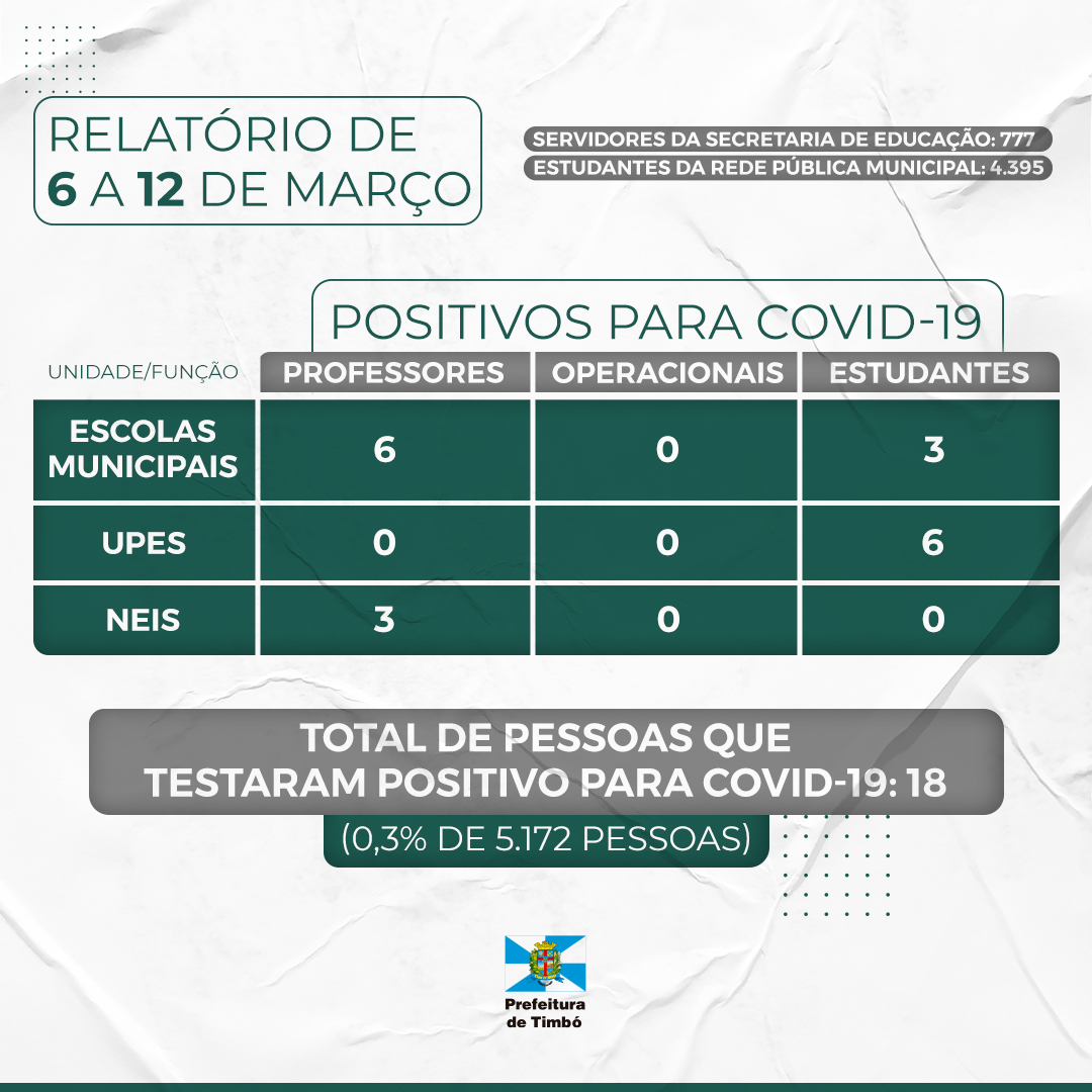 Prezando pela transparência na divulgação dos dados, a Prefeitura de Timbó, através da Secretaria Municipal de Educação (Semed), estará emitindo um relatório semanal de casos de Covid-19 na rede pública municipal de ensino.